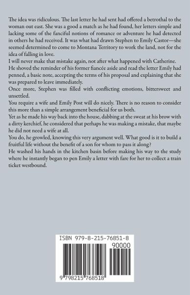 The idea was ridiculous. The last letter he had sent had offered a betrothal to the woman out east. She was a good a match as he had found, her letters simple and lacking some of the fanciful notions of romance or adventure he had detected in others he had received. It was what had drawn Stephen to Emily Castor—she seemed determined to come to Montana Territory to work the land, not for the idea of falling in love. I will never make that mistake again, not after what happened with Catherine. He shoved the reminder of his former fiancée aside and read the letter Emily had penned, a basic note, accepting the terms of his proposal and explaining that she was prepared to leave immediately. Once more, Stephen was filled with conflicting emotions, bittersweet and unsettled. You require a wife and Emily Post will do nicely. There is no reason to consider this more than a simple arrangement beneficial for us both. Yet as he made his way back into the house, dabbing at the sweat at his brow with a dirty kerchief, he considered that perhaps he was making a mistake, that maybe he did not need a wife at all. You do, he growled, knowing this very argument well. What good is it to build a fruitful life without the benefit of a son for whom to pass it along? He washed his hands in the kitchen basin before making his way to the study where he instantly began to pen Emily a letter with fare for her to collect a train ticket westbound.