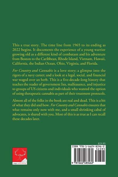 This a true story. The time line from 1965 to its ending as 2022 begins. It documents the experience of a young warrior growing old as a different kind of combatant and his adventure from Boston to the Caribbean, Rhode Island, Vietnam, Hawaii, California, the Indian Ocean, Ohio, Virginia, and Florida. For Country and Cannabis is a love story; a glimpse into the rigors of a navy career; and a look at a legal, social, and financial war waged over an herb. This is a five-decade-long history that teaches the reader of government lies, malfeasance, and injustice to groups of US citizens and individuals who wanted the option of using therapeutic cannabis as part of their treatment protocols. Almost all of the folks in the book are real and dead. This is a bit of what they did and how. For Country and Cannabis ensures that what remains only now with me, and a small shrinking cabal of advocates, is shared with you. Most of this is as true as I can recall these decades later.