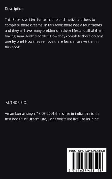 Author written this book to inspire and motivate others for there dreams .This book was based on friendship, love and madness for dreams. In this book there are four friends and how they complete there dreams of travelling and how they remove there fears and many other things was writeen in this book.