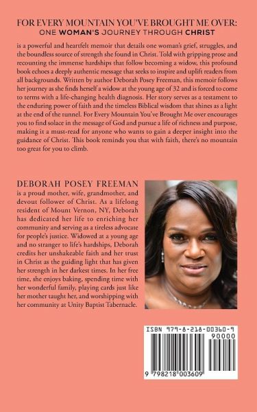 Step into one woman's powerful journey up the mountain of grief and loss-along with the remarkable faith that guided her to the summit. Artfully written as an enduring message of hope and resilience in the face of life's toughest challenges, this illuminating memoir invites you into author Deborah Posey Freeman's journey, sharing the passionate faith and spiritual wisdom that helped her overcome life's tallest mountains. Recounting her painful story of finding herself widowed and a single mother at the young age of 32, along with the shock of a life-changing medical diagnosis, For Every Mountain You've Brought Me Over is a testament to the power and guidance of Christ. As a touching read that encourages readers to find solace in God and discover the light at the end of the tunnel, this memoir seeks to empower readers from all walks of life, showing you that no matter what kind of proverbial mountains you must climb, the lessons of Christ are there to help you overcome it. Deborah shares the wisdom that gave her a boundless source of strength in her darkest hour, along with how God's presence gave her guidance throughout her life's struggles. Ranging across poignant themes of grief and loss, becoming a single mother, living with HIV, familial issues, and how you can keep an unshakeable faith no matter what life throws at you, For Every Mountain You've Brought Me Over is a deeply redeeming memoir that will give you a newfound perspective on the value of Christianity and the love that God has for each of us.