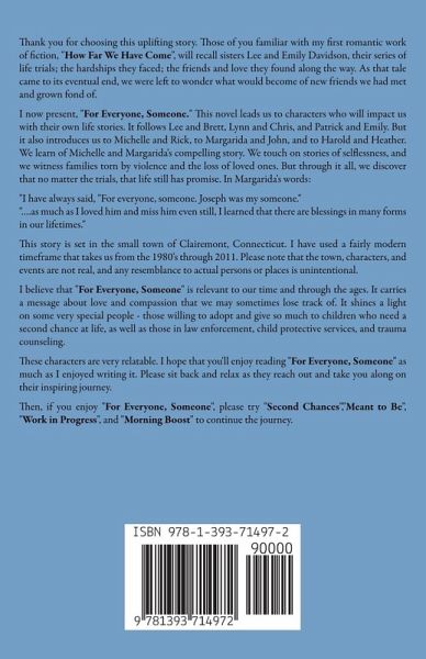 Thank you for choosing this uplifting story. Those of you familiar with my first romantic work of fiction, "How Far We Have Come", will recall sisters Lee and Emily Davidson, their series of life trials; the hardships they faced; the friends and love they found along the way. As that tale came to its eventual end, we were left to wonder what would become of new friends we had met and grown fond of. I now present, "For Everyone, Someone." This novel leads us to characters who will impact us with their own life stories. It follows Lee and Brett, Lynn and Chris, and Patrick and Emily. But it also introduces us to Michelle and Rick, to Margarida and John, and to Harold and Heather. We learn of Michelle and Margarida's compelling story. We touch on stories of selflessness, and we witness families torn by violence and the loss of loved ones. But through it all, we discover that no matter the trials, that life still has promise. In Margarida's words: "I have always said, "For everyone, someone. Joseph was my someone." "….as much as I loved him and miss him even still, I learned that there are blessings in many forms in our lifetimes." This story is set in the small town of Clairemont, Connecticut. I have used a fairly modern timeframe that takes us from the 1980's through 2011. Please note that the town, characters, and events are not real, and any resemblance to actual persons or places is unintentional. I believe that "For Everyone, Someone" is relevant to our time and through the ages. It carries a message about love and compassion that we may sometimes lose track of. It shines a light on some very special people - those willing to adopt and give so much to children who need a second chance at life, as well as those in law enforcement, child protective services, and trauma counseling. These characters are very relatable. I hope that you'll enjoy reading "For Everyone, Someone" as much as I enjoyed writing it. Please sit back and relax as they reach out and take you along on their inspiring journey. Then, if you enjoy "For Everyone, Someone", please try "Second Chances","Meant to Be", "Work in Progress", and "Morning Boost" to continue the journey.