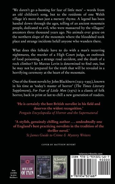 'We daren't go a-hunting for fear of little men' - words from an old children's song, but to the residents of one Welsh village it's more than just a nursery rhyme. A legend has been handed down through the ages, telling of an ancient mountain people, dedicated to evil, who were massacred by the villagers' ancestors three thousand years ago. No animals ever graze on the northern slope of the mountain where the bloodshed took place and strange incidents befall anyone who wanders there. What does this folktale have to do with a man's recurring nightmares, the murder of a High Court judge, an outbreak of food poisoning, a strange road accident, and the death of a rock climber? Sir Marcus Levin is determined to find out, but he may not be prepared for the truth that will be revealed in a horrifying ceremony at the heart of the mountain. One of the finest novels by John Blackburn (1923-1993), known in his time as 'today's master of horror' (The Times Literary Supplement), For Fear of Little Men (1972) is a classic of folk horror, back in print at last to chill a new generation of readers. 'He is certainly the best British novelist in his field and deserves the widest recognition.' - Penguin Encyclopedia of Horror and the Supernatural 'A stylish, genuinely chilling author . . . undoubtedly one of England's best practicing novelists in the tradition of the thriller novel.' - St James Guide to Crime & Mystery Writers