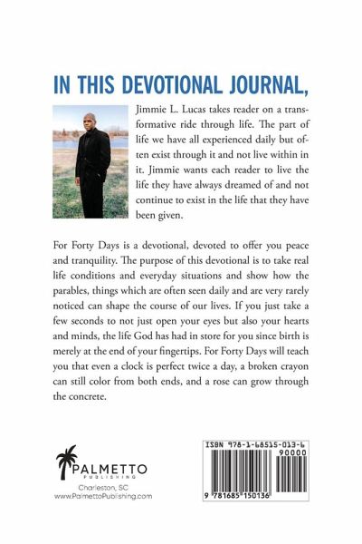 In this devotional journal, Jimmie L. Lucas takes reader on a transformative ride through life. The part of life we have all experienced daily but often exist through it and not live within in it. Jimmie wants each reader to live the life they have always dreamed of and not continue to exist in the life that they have been given. For Forty Days is a devotional, devoted to offer you peace and tranquility. The purpose of this devotional is to take real life conditions and everyday situations and show how the parables, things which are often seen daily and are very rarely noticed can shape the course of our lives. If you just take a few seconds to not just open your eyes but also your hearts and minds, the life God has had in store for you since birth is merely at the end of your fingertips. For Forty Days will teach you that even a clock is perfect twice a day, a broken crayon can still color from both ends, and a rose can grow through the concrete.