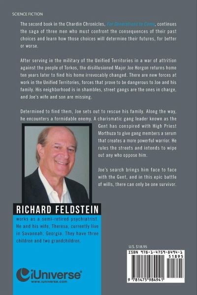 The second book in the Chardin Chronicles, For Generations to Come, continues the saga of three men who must confront the consequences of their past choices and learn how those choices will determine their futures, for better or worse. After serving in the military of the Unified Territories in a war of attrition against the people of Torkos, the disillusioned Major Joe Horgon returns home ten years later to find his home irrevocably changed. There are new forces at work in the Unified Territories, forces that prove to be dangerous to Joe and his family. His neighborhood is in shambles, street gangs are the ones in charge, and Joe's wife and son are missing. Determined to find them, Joe sets out to rescue his family. Along the way, he encounters a formidable enemy. A charismatic gang leader known as the Gent has conspired with High Priest Morthuza to give gang members a serum that creates a more powerful warrior. He rules the streets and intends to wipe out any who oppose him. Joe's search brings him face to face with the Gent, and in this epic battle of wills, there can only be one survivor.