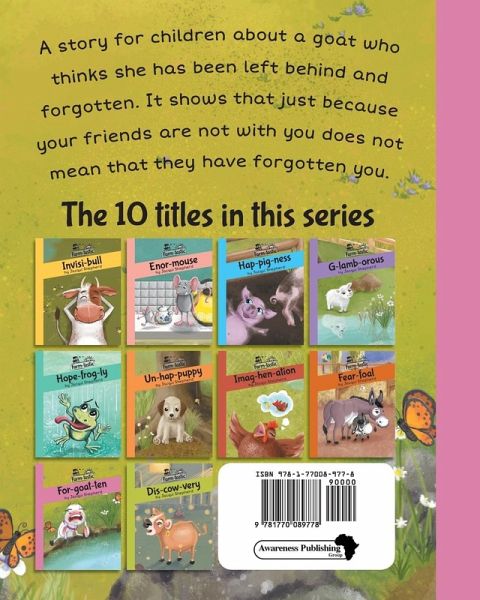 For-goat-ten is about Roxi the goat who thinks she has been left behind and forgotten. The story shows that just because your friends are not with you does not mean that they have forgotten you. Vibrant illustrations by Dana Espag really bring the story to life. Playing with words is part of the fun and in this book the words ‘forgotten’ and ‘goat’ have been put together to make a playful word ‘for-goat-ten’ – which means a goat who is feeling forgotten or left behind. Before you know it ‘for-goat-ten’ could become part of your child’s vocabulary! For-goat-ten is one of the ten books in the exciting Farm-tastic series by children’s author Jacqui Shepherd. Each book features an animal on a farm and highlights an important life lesson through the story. The books have beautiful, full-colour illustrations and accessible language for both first- and second-language learners. The word play used in all the books adds an extra element of fun that children are sure to love. The books are perfect for reading to little ones and for older children to read by themselves. Other titles in the series include: Invisi-bull Enor-mouse Hap-pig-ness Hope-frog-ly G-lamb-orous Un-hap-puppy Imag-hen-ation Fear-foal Dis-cow-very Read them all! By relating to the adorable farm characters featured in these stories children will not only be entertained but also be encouraged to adopt values and attitudes that will help them in their daily lives. Follow our Awareness Publishing Facebook page for the latest news and updates on this and other series.