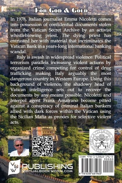 In 1978, Italian journalist Emma Nicoletti comes into possession of confidential documents stolen from the Vatican Secret Archive by an activist whistleblowing priest. The dying priest has entrusted her with material that incriminates the Vatican Bank in a years-long international banking scandal. Italy is awash in widespread violence. Political terrorism parallels increasing violent actions by organized crime competing for control of drug trafficking making Italy arguably the most dangerous country in Western Europe. Using this background of violence, the shadowy head of Vatican intelligence sets out to recover the documents by any means possible. Nicoletti and Interpol agent Frank Amatrano become pitted against a conspiracy of criminal Italian bankers allied with dark forces within the Vatican using the Sicilian Mafia as proxies for selective violent acts.