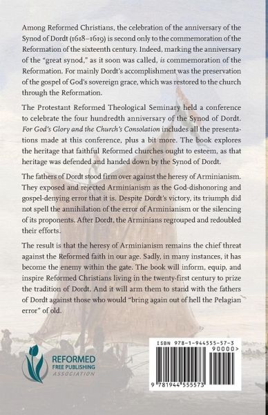 Among Reformed Christians, the celebration of the anniversary of the Synod of Dordt (1618–19) is second only to the commemoration of the Reformation of the sixteenth century. Indeed, marking the anniversary of the "great synod," as it soon was called, is commemoration of the Reformation. For mainly Dordt’s accomplishment was the preservation of the gospel of God’s sovereign grace, which was restored to the church through the Reformation. The Protestant Reformed Theological Seminary held a conference to celebrate the four hundredth anniversary of the Synod of Dordt. For God’s Glory and the Church’s Consolation includes all the presentations made at this conference, plus a bit more. The book explores the heritage that faithful Reformed churches ought to esteem, as that heritage was defended and handed down by the Synod of Dordt. The chapters included in this book are written by: Rev. Angus Stewart, Prof. Brian Huizinga, Rev. Mark Shand, Prof. Douglas Kuiper, Rev. William Langerak, Prof. Ronald Cammenga, and Prof. Barrett Gritters.