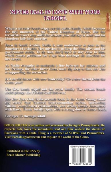Never fall in love with your target. When a terrorist bomb wipes out his entire family, Salah becomes the new monarch of the United Kingdom of Hejaz. But the terrorists won't stop until the sixteen-year-old boy is dead, and his kingdom falls into anarchy. ¿Born in Saudi Arabia, Nadia is sent undercover to pose as the daughter of a sheikh. Her mission is to keep the king alive and his government stable. To do that, she'll have to stay close to him, which causes problems for a spy who develops an affection for her target. As Nadia struggles to maintain a line between her mission and her feelings, the other three Gems must dig deep to find out who is supporting the terrorists. ¿Is it an old threat with new leadership? Or a new threat from the Gems past? ¿The first bomb wiped out the royal family. ¿The second bomb could plunge the Persian Gulf into war. For Her Eyes Only is the seventh book in the Gems Young Adult spy series that features heart-pounding action, interesting villains, complicated relationships, and strong female characters with flaws. Think Totally Spies with a strong dose of James Bond. If you enjoy spy thrillers with immersive plots, and a complex relationship with characters who make you laugh and cry, then the seventh book in Doug Solter's continuing young adult spy series is for you. For ages 13 through adult. Book 7 of 8