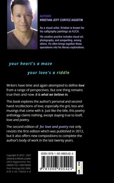 Writers have time and again attempted to define love from a range of perspectives. But one thing remains true then and now: it is what we believe in. This book explores the author's personal and second-hand recollections of love, especially the grit, loss and musings that come with it. Just like the title, this poetry anthology claims nothing, except staying true to itself, love and poetry. This second edition of FOR LOVE AND POETRY not only revisits the first edition which was published in 2012, but it also offers new compositions to complete the author's body of work in the last twenty years. First Printing ISBN 978-0-9574658-4-8 Published 2021 Copyright © 2012 - 2021 Kristian Jeff Cortez Agustin