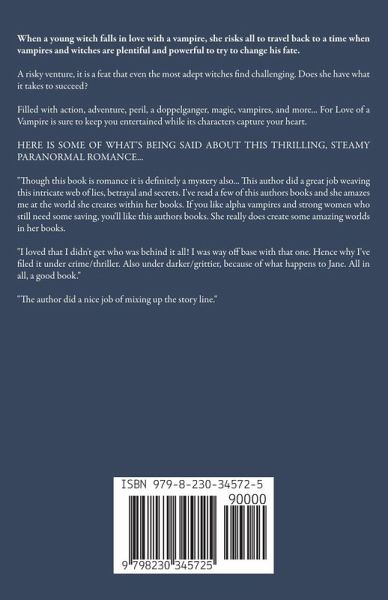 When a young witch falls in love with a vampire, she risks all to travel back to a time when vampires and witches are plentiful and powerful to try to change his fate. A risky venture, it is a feat that even the most adept witches find challenging. Does she have what it takes to succeed? Filled with action, adventure, peril, a doppelganger, magic, vampires, and more... For Love of a Vampire is sure to keep you entertained while its characters capture your heart. HERE IS SOME OF WHAT'S BEING SAID ABOUT THIS THRILLING, STEAMY PARANORMAL ROMANCE... "Though this book is romance it is definitely a…mehr