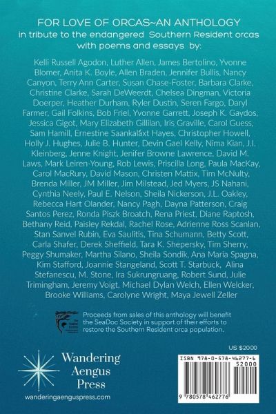 After the Southern Resident orca Tahlequah swam with her newly born dead calf for 17 days, scientists, poets, and writers responded to her grief and the plight of the endangered orcas in this moving anthology. Edited by poets Andrew Shattuck McBride and Jill McCabe Johnson, the anthology features poetry, essays, and environmental writing from more than ninety esteemed authors. Wandering Aengus Press is donating proceeds from the book to the SeaDoc Society for their efforts in helping restore the Southern Resident orca population. Contributors include: Kelli Russell Agodon, Luther Allen, James Bertolino, Yvonne Blomer, Anita K. Boyle, Allen Braden, Jennifer Bullis, Nancy Canyon, Terry Ann Carter, Susan Chase-Foster, Barbara Clarke, Christine Clarke, Sarah DeWeerdt, Chelsea Dingman, Victoria Doerper, Heather Durham, Ryler Dustin, Seren Fargo, Daryl Farmer, Gail Folkins, Bob Friel, Yvonne Garrett, Joseph K. Gaydos, Jessica Gigot, Mary Elizabeth Gillilan, Iris Graville, Carol Guess, Sam Hamill, Ernestine Saankalaxt Hayes, Christopher Howell, Holly J. Hughes, Julie B. Hunter, Devin Gael Kelly, Nima Kian, J.I. Kleinberg, Jenne Knight, Jenifer Browne Lawrence, David M. Laws, Mark Leiren-Young, Rob Lewis, Priscilla Long, Paula MacKay, Carol MacRury, David Mason, Christen Mattix, Tim McNulty, Brenda Miller, JM Miller, Jim Milstead, Jed Myers, JS Nahani, Cynthia Neely, Paul E. Nelson, Sheila Nickerson, J.L. Oakley, Rebecca Hart Olander, Nancy Pagh, Dayna Patterson, Craig Santos Perez, Ronda Piszk Broatch, Rena Priest, Diane Raptosh, Bethany Reid, Paisley Rekdal, Rachel Rose, Adrienne Ross Scanlan, Stan Sanvel Rubin, Eva Saulitis, Tina Schumann, Betty Scott, Carla Shafer, Derek Sheffield, Tara K. Shepersky, Tim Sherry, Peggy Shumaker, Martha Silano, Sheila Sondik, Ana Maria Spagna, Kim Stafford, Joannie Stangeland, Scott T. Starbuck, Alina Stefanescu, M. Stone, Ira Sukrungruang, Robert Sund, Julie Trimingham, Jeremy Voigt, Michael Dylan Welch, Ellen Welcker, Brooke Williams, Carolyne Wright, Maya Jewell Zeller.