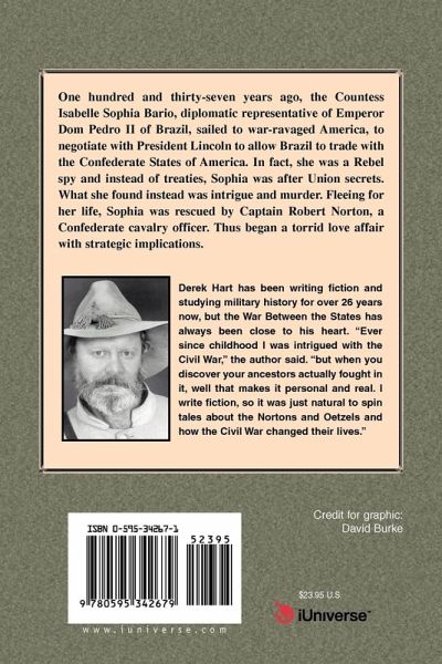 One hundred and thirty-seven years ago, the Countess Isabelle Sophia Bario, diplomatic representative of Emperor Dom Pedro II of Brazil, sailed to war-ravaged America, to negotiate with President Lincoln to allow Brazil to trade with the Confederate States of America. In fact, she was a Rebel spy and instead of treaties, Sophia was after Union secrets. What she found instead was intrigue and murder. Fleeing for her life, Sophia was rescued by Captain Robert Norton, a Confederate cavalry officer. Thus began a torrid love affair with strategic implications.