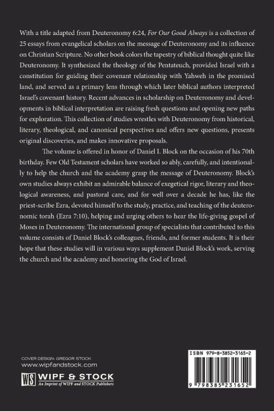With a title adapted from Deuteronomy 6:24, For Our Good Always is a collection of 25 essays from evangelical scholars on the message of Deuteronomy and its in¿uence on Christian Scripture. No other book colors the tapestry of biblical thought quite like Deuteronomy. It synthesized the theology of the Pentateuch, provided Israel with a constitution for guiding their covenant relationship with Yahweh in the promised land, and served as a primary lens through which later biblical authors interpreted Israel's covenant history. Recent advances in scholarship on Deuteronomy and developments in biblical interpretation are raising fresh questions and opening new paths for exploration. This collection of studies wrestles with Deuteronomy from historical, literary, theological, and canonical perspectives and öers new questions, presents original discoveries, and makes innovative proposals. The volume is öered in honor of Daniel I. Block on the occasion of his 70th birthday. Few Old Testament scholars have worked so ably, carefully, and intentionally to help the church and the academy grasp the message of Deuteronomy. Block's own studies always exhibit an admirable balance of exegetical rigor, literary and theological awareness, and pastoral care, and for well over a decade he has, like the priest-scribe Ezra, devoted himself to the study, practice, and teaching of the deuteronomic torah (Ezra 7:10), helping and urging others to hear the life-giving gospel of Moses in Deuteronomy. The international group of specialists that contributed to this volume consists of Daniel Block's colleagues, friends, and former students. It is their hope that these studies will in various ways supplement Daniel Block's work, serving the church and the academy and honoring the God of Israel.