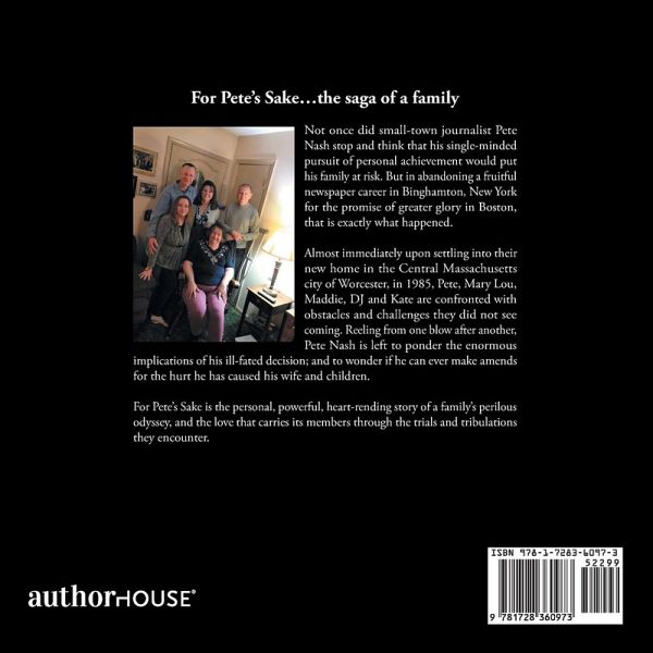 For Pete's Sake is a fictionalized, personal, powerful, heart-rending account of a family's move from a small upstate New York town to bustling Worcester, Massachusetts and the many obstacles and challenges that arose from this relocation. It is the story of a husband and father's attempts to atone for the hurt he caused his wife and children.