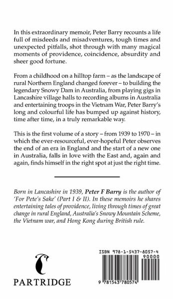 In this extraordinary memoir, Peter Barry recounts a life full of misdeeds and misadventures, tough times and unexpected pitfalls, shot through with many magical moments of providence, coincidence, absurdity and sheer good fortune. From a childhood on a hilltop farm - as the landscape of rural Northern England changed forever - to building the legendary Snowy Dam in Australia, from playing gigs in Lancashire village halls to recording albums in Australia and entertaining troops in the Vietnam War, Peter Barry's long and colourful life has bumped up against history, time after time, in a truly remarkable way. This is the first volume of a story - from 1939 to 1970 - in which the ever-resourceful, ever-hopeful Peter observes the end of an era in England and the start of a new one in Australia, falls in love with the East and, again and again, finds himself in the right spot at just the right time.
