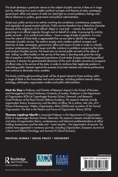 Simply put, public service is an activity involving the constitution, maintenance, projection and regulation of governmental authority. Public service therefore has a distinctive character because of the singularity of its 'official' object or 'core task' - namely, the activity of governing in an official capacity through and on behalf of a state. In pursuing this activity, public servants - civil, juridical and military - have a range of tasks to perform. It is only once the nature of those tasks is appreciated that we are able to identify the unique character of public service. The authors employ early modern political concepts and doctrines of state, sovereignty, government, office and reason of state in order to critically analyse contemporary political issues and offer solutions to problems concerning the status and conduct of public service. This book aims to remind public servants of the status of their 'calling' as office-holders in the service of the state, a daunting task given the rising tide of populism and the widespread prevalence of anti-statist, bureaucrat-bashing political discourse. It stresses the governmental dimension of the work of public servants as occupants of official roles in the service of the state, in order to reinforce their legitimate position in articulating public interests against the excesses of private interests and intense partisanship that continue to dominate many societies.