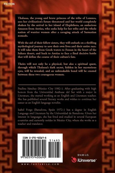 Thalassa, the young and brave princess of the tribe of Lemnos, sees her civilization's future threatened and her world completely shaken by the arrival in her island of Elephthera, an audacious Amazon from Aretias, who seeks help for her tribe and the whole nation of warrior women after a ravaging attack of Sarmatian nomads. With the aid of their fellow sisters, they will embark on a thrilling mythological journey to save their own lives and their entire race. It will take them from Greek waters to Fezzan in the heart of the Sahara desert, and back to Aretias to face a final decisive battle that will define the course of their culture's fate. Theirs will not only be a physical, but also a spiritual quest, through which Thalassa's dark secret, hidden in her mysterious eyes, will be revealed, and an unbreakable bond will be created between these two courageous women.