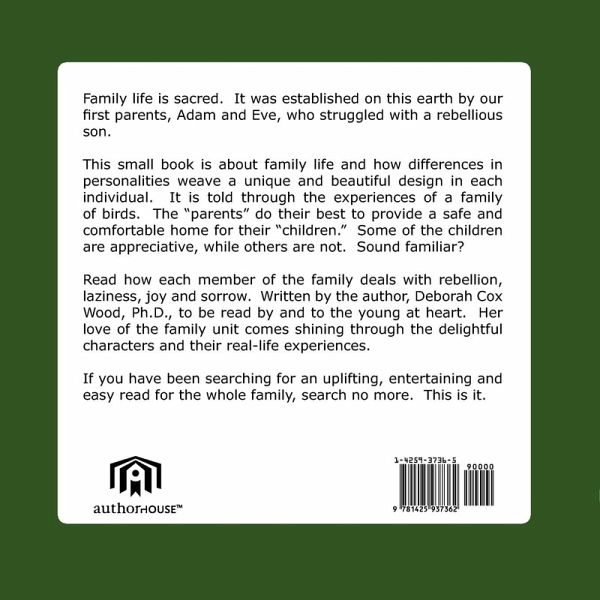 Family life is sacred. It was established on this earth by our first parents, Adam and Eve, who struggled with a rebellious son. This small book is about family life and how differences in personalities weave a unique and beautiful design in each individual. It is told through the experiences of a family of birds. The "parents" do their best to provide a safe and comfortable home for their "children." Some of the children are appreciative, while others are not. Sound familiar? Read how each member of the family deals with rebellion, laziness, joy and sorrow. Written by the author, Deborah Cox Wood, Ph.D., to be read by and to the young at heart. Her love of the family unit comes shining through the delightful characters and their real-life experiences. If you have been searching for an uplifting, entertaining and easy read for the whole family, search no more. This is it.