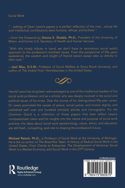 For the Common Good is an anthology of selected essays by Dr. Harold Lewis, one of the intellectual leaders of the social work profession. Social work literature often reflects powerful ahistorical tendencies which, in recent years, have produced analyses of social issues that lack awareness of both the contemporary environment and the historical forces that shaped it. Lewis' insights into the nature and purpose of social work help fill some of these historical and conceptual gaps, and present a clearer picture of social work's true place in our society.