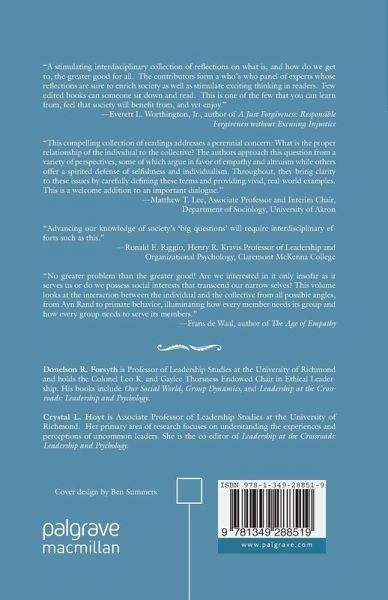 "No greater problem than the greater good! Are we interested in it only insofar as it serves us, as some would argue, or do we possess social interests that transcend our narrow selves? This volume looks at the interaction between the individual and the collective from all possible angles, from Ayn Rand to primate behavior, illuminating how every member needs its group and how every group needs to serve its members." - Frans de Waal, author of The Age of Empathy