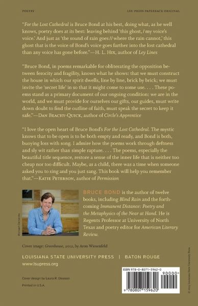 For the Lost Cathedral delves deeply into the human relationship with the divine and its capacity for empathy, transformation, and the tolerance of difference and doubt. Bruce Bond seeks neither to praise nor to attack institutional religions, instead choosing to explore their interactions with the inner lives of those who hold them sacred. Faith can offer comfort and security in difficult times, yet it may also create the temptation to hold to absolutes. For the Lost Cathedral examines the tensions inherent in spiritual devotion as well as the impact of such devotion on our most defining conflicts, creativities, and acts of sacrifice.