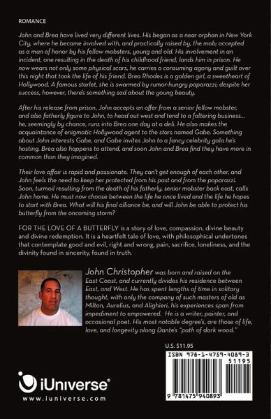 John and Brea have lived very different lives. His began as a near orphan in New York City, where he became involved with, and practically raised by, the mob; accepted as a man of honor by his fellow mobsters, young and old. His involvement in an incident, one resulting in the death of his childhood friend, lands him in prison. He now wears not only some physical scars, he carries a consuming agony and guilt over this night that took the life of his friend. Brea Rhodes is a golden girl, a sweetheart of Hollywood. A famous starlet, she is swarmed by rumor-hungry paparazzi; despite her success, however, there's something sad about the young beauty. After his release from prison, John accepts an offer from a senior fellow mobster, and also fatherly figure to John, to head out west and tend to a faltering business...he, seemingly by chance, runs into Brea one day at a deli. He also makes the acquaintance of enigmatic Hollywood agent to the stars named Gabe. Something about John interests Gabe, and Gabe invites John to a fancy celebrity gala he's hosting. Brea also happens to attend, and soon John and Brea find they have more in common than they imagined. Their love affair is rapid and passionate. They can't get enough of each other, and John feels the need to keep her protected from his past and from the paparazzi. Soon, turmoil resulting from the death of his fatherly, senior mobster back east, calls John home. He must now choose between the life he once lived and the life he hopes to start with Brea. What will his final alliance be, and will John be able to protect his butterfly from the oncoming storm? FOR THE LOVE OF A BUTTERFLY is a story of love, compassion, divine beauty and divine redemption. It is a heartfelt tale of love, with philosophical undertones that contemplate good and evil, right and wrong, pain, sacrifice, loneliness, and the divinity found in sincerity, found in truth.