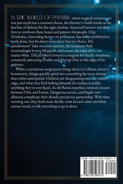 In the world of Phyrra, where magical creatures are not just myth but a constant threat, the Hunter's Guild stands as the last line of defense for the eight duchies. Seasoned hunters risk their lives to confront these beasts and protect the people. Ulric Ornthalas, a brooding hunter on probation, has always preferred to work alone, but his latest terms leave him no choice. His punishment? Take on a new partner, the tenacious field monstralogist Iowyn Morgnah, and ensure she stays alive-no matter what. The problem? Iowyn is a magnet for deadly situations, constantly attracting trouble and driving Ulric to the edge of his patience. When a mysterious assignment brings them to Calluna, Iowyn's childhood home, things quickly spiral into something far more sinister than either anticipated. Children are disappearing near the water's edge, and what they find lurking beneath the surface is unlike anything they've ever faced. As old flames resurface, tensions mount between Ulric and Iowyn. Dangerous secrets, and fragile new alliances complicate their already precarious partnership. With time running out, they both must decide: trust in each other and their uneasy bond, or risk everything to go it alone.