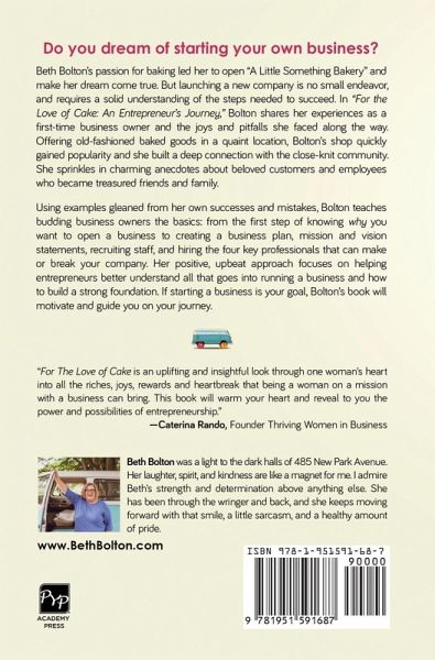 Do you dream of starting your own business? Beth Bolton's passion for baking led her to open "A Little Something Bakery" and make her dream come true. But launching a new company is no small endeavor, and requires a solid understanding of the steps needed to succeed. In For the Love of Cake: An Entrepreneur's Journey, Bolton shares her experiences as a first-time business owner and the joys and pitfalls she faced along the way. Offering old-fashioned baked goods in a quaint location, Bolton's shop quickly gained popularity and she built a deep connection with the close-knit community. She sprinkles in charming anecdotes about beloved customers and employees who became treasured friends and family. Using examples gleaned from her own successes and mistakes, Bolton teaches budding business owners the basics: from the first step of knowing why you want to open a business to creating a business plan, mission and vision statements, recruiting staff, and hiring the four key professionals that can make or break your company. Her positive, upbeat approach focuses on helping entrepreneurs better understand all that goes into running a business and how to build a strong foundation. If starting a business is your goal, Bolton's book will motivate and guide you on your journey.