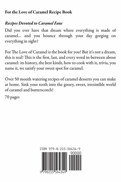 For the Love of Caramel Recipe Book Recipes Devoted to Caramel Fans Did you ever have that dream where everything is made of caramel… and you bounce through your day gorging on everything in sight? For The Love of Caramel is the book for you! But it's not a dream, this is real! This is the first, last, and every word in-between about caramel: its history, the best kinds, how to cook with it, trivia, you name it, we satisfy your sweet spot for caramel. Over 50 mouth watering recipes of caramel desserts you can make at home. Sink your teeth into the gooey, sweet, irresistible world of caramel and butterscotch! 70pages