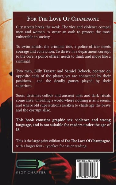City streets break the weak. The vice and violence compel men and women to swear an oath to protect the most vulnerable in society. To swim amidst the criminal tide, a police officer needs courage and conviction. To thrive in a department corrupt to the core, a police officer needs to think and move like a criminal. Two men, Billy Tanarat and Samiel Deboch, operate on opposite ends of the planet, yet are connected by their positions... and the deadly games played by their superiors. Soon, destinies collide and ancient tales and dark rituals come alive, unveiling a world where nothing is as it seems, and where old superstitions awaken to challenge the brave and the corrupt alike. This book contains graphic sex, violence and graphic language, and is not suitable for readers under the age of 18. ¿¿This is the large print edition of For The Love Of Champagne, with a larger font / typeface for easier reading.