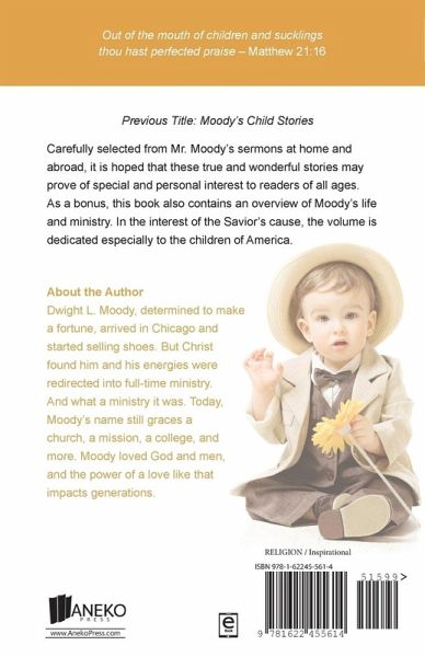 Previous Title: Moody's Child Stories Carefully selected from Mr. Moody's sermons at home and abroad, it is hoped that these true and wonderful stories may prove of special and personal interest to readers of all ages. As a bonus, this book also contains an overview of Moody's life and ministry. In the interest of the Savior's cause, the volume is dedicated especially to the children of America. About the Author Dwight L. Moody, determined to make a fortune, arrived in Chicago and started selling shoes. But Christ found him and his energies were redirected into full-time ministry. And what a ministry it was. Today, Moody's name still graces a church, a mission, a college, and more. Moody loved God and men, and the power of a love like that impacts generations.