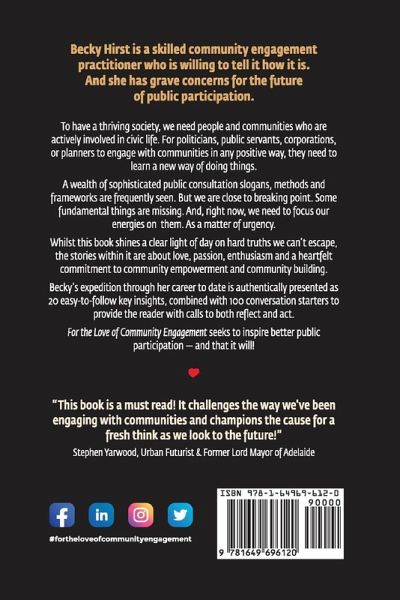Becky Hirst is a skilled community engagement practitioner who is willing to tell it how it is. And she has grave concerns for the future of public participation. To have a thriving society, we need people and communities who are actively involved in civic life. For politicians, public servants, corporations, or planners to engage with communities in any positive way, they need to learn a new way of doing things. A wealth of sophisticated public consultation slogans, methods and frameworks are frequently seen. But we are close to breaking point. Some fundamental things are missing. And, right now, we need to focus our energies on them. As a matter of urgency. Whilst this book shines a clear light of day on hard truths we can't escape, the stories within it are about love, passion, enthusiasm and a heartfelt commitment to community empowerment and community building. Becky's expedition through her career to date is authentically presented as 20 easy-to-follow key insights, combined with 100 conversation starters to provide the reader with calls to both reflect and act. For the Love of Community Engagement seeks to inspire better public participation - and that it will!