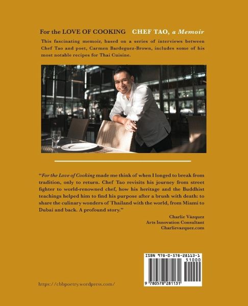 For the Love of Cooking is a fascinating memoir, based on a series of interviews between Chef Tao and poet, Carmen Bardeguez-Brown, and includes some of his most notable recipes for Thai Cuisine. "For the Love of Cooking made me think of when I longed to break from tradition, only to return. Chef Tao revisits his journey from street fighter to world-renowned chef, how his heritage and the Buddhist teachings helped him to find his purpose after a brush with death: to share the culinary wonders of Thailand with the world, from Miami to Dubai and back. A profound story."Charlie VázquezArts Innovation ConsultantCharlievazquez.com