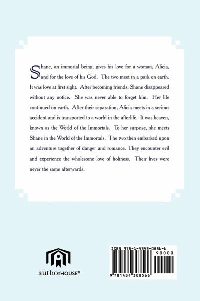 Shane, an immortal being, gives his love for a woman, Alicia, and for the love of his God. The two meet in a park on earth. It was love at first sight. After becoming friends, Shane disappeared without any notice. She was never able to forget him. Her life continued on earth. After their separation, Alicia meets in a serious accident and is transported to a world in the afterlife. It was heaven, known as the World of the Immortals. To her surprise, she meets Shane in the World of the Immortals. The two then embarked upon an adventure together of danger and romance. They encounter evil and experience the wholesome love of holiness. Their lives were never the same afterwards.