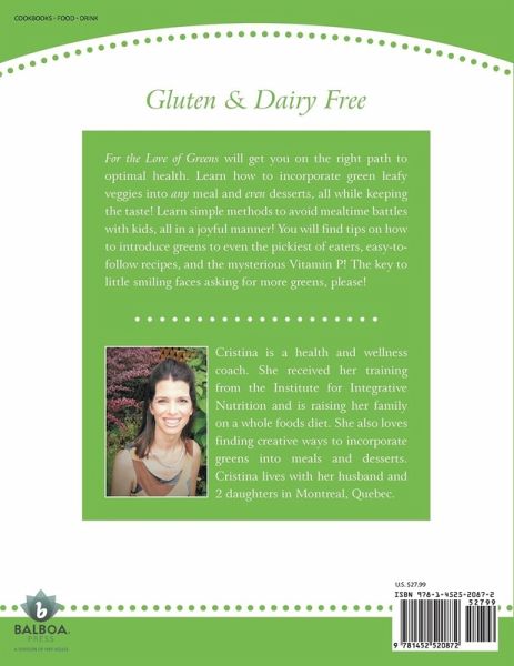 For the Love of Greens will get you on the right path to optimal health. Learn how to incorporate green leafy veggies into any meal and even desserts, all while keeping the taste! Learn simple methods to avoid mealtime battles with kids, all in a joyful manner! You will find tips on how to introduce greens to even the pickiest of eaters, easy-to-follow recipes, and the mysterious Vitamin P! The key to little smiling faces asking for more greens, please!
