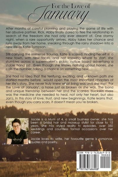 In the third installment of the Calender series by Jackie Clark, we meet Abby. Abby takes a chance to escape from a life of abuse and start over in a new place, with a new name. When the opportunity comes up to work as a stable hand, Abby, now Katie, applies despite having no experience, this sets off a chain of events that change her life, and that of an abused horse. Jackie's unique way of story-telling captures the heart of Australia, along with the quirks of the Australian dialect.