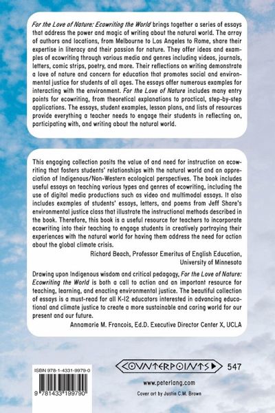 Drawing upon Indigenous wisdom and critical pedagogy, For the Love of Nature: Ecowriting the World is both a call to action and an important resource for teaching, learning, and enacting environmental justice. The beautiful collection of essays is a must-read for all K-12 educators interested in advancing educational and climate justice to create a more sustainable and caring world for our present and our future.