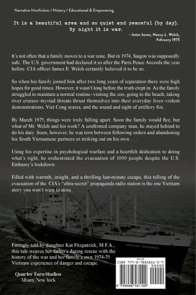What happens when a corrupt cease-fire goes wrong? Crack open this quick-paced narrative to find out. In 1974, CIA operative James E. Welch had been in Saigon for nearly two years when his wife, seven kids, and one black poodle were cleared to join him. The happy family reunion soon devolved into days filled with tension, then with terror, as the North Vietnam Army stepped up its military operations. Soon it was clear that Saigon was in the cross-hairs and the family fled the scene. Would Mr. Welch soon follow? How could he when the safety of over 1000 people fell squarely on his shoulders? In this page-turner, Kat Fitzpatrick weaves her father's daring evacuation with the history of the war and her family's own Vietnam experience of danger and escape. "It is a beautiful area and so quiet and peaceful (by day). By night it is war." ~ letter home, Nancy L. Welch, February 1975¿