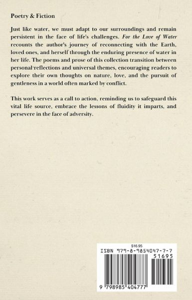 Just like water, we must adapt to our surroundings and remain persistent in the face of life's challenges. For the Love of Water recounts the author's journey of reconnecting with the Earth, loved ones, and herself through the enduring presence of water in her life. The poems and prose of this collection transition between personal reflections and universal themes, encouraging readers to explore their own thoughts on nature, love, and the pursuit of gentleness in a world often marked by conflict. This work serves as a call to action, reminding us to safeguard this vital life source, embrace the lessons of fluidity it imparts, and persevere in the face of adversity