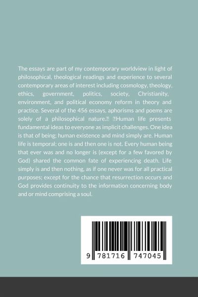 The essays are part of my contemporary worldview in light of philosophical, theological readings and experience to several contemporary areas of interest including cosmology, theology, ethics, government, politics, society, Christianity, environment, and political economy reform in theory and practice. Several of the 456 essays, aphorisms and poems are solely of a philosophical nature. Human life presents fundamental ideas to everyone as implicit challenges. One idea is that of being; human existence and mind simply are. Human life is temporal; one is and then one is not. Every human being that ever was and no longer is (except for a few favored by God) shared the common fate of experiencing death. Life simply is and then nothing, as if one never was for all practical purposes; except for the chance that resurrection occurs and God provides continuity to the information concerning body and or mind comprising a soul.