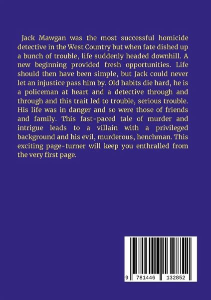 Jack Mawgan was the most successful homicide detective in the West Country but when fate dished up a bunch of trouble, life suddenly headed downhill. A new beginning provided fresh opportunities. Life should then have been simple, but Jack could never let an injustice pass him by. Old habits die hard, he is a policeman at heart and a detective through and through and this trait led to trouble, serious trouble. His life was in danger and so were those of friends and family. This fast-paced tale of murder and intrigue leads to a villain with a privileged background and his evil, murderous, henchman. This exciting page-turner will keep you enthralled from the very first page.