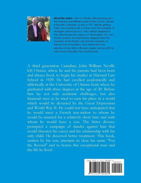 A third-generation Canadian, John Neville left Ottawa, where he and his parents had been born and always lived, to begin his studies at Harvard Law School in 1929. He had excelled academically and athletically at the University of Ottawa from where he graduated with three degrees at the age of 20. Before him lay not only academic challenges, but also financial ones as he tried to earn his place in a world which would be devastated by the Great Depression and World War II. He could not have anticipated that he would meet a French war-widow to whom he would be married for a relatively short time and with whom he would have a son. The bitter divorce prompted a campaign of slander against him that would threaten his career and his relationship with his only child. He deserved better treatment. This book, written by his son, attempts to clear his name "For the Record" and to honor this exceptional man and the life he lived.