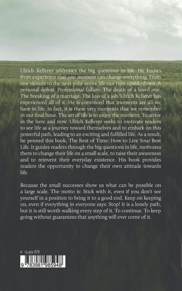 Ulrich Kellerer addresses the big questions in life. He knows from experience that one moment can change everything. From one minute to the next your entire life can turn upside down. A personal defeat. Professional failure. The death of a loved one. The breaking of a marriage. The loss of a job. Ulrich Kellerer has experienced all of it. He is convinced that moments are all we have in life. In fact, it is these very moments that we remember in our final hour. The art of life is to enjoy the moment. To arrive in the here and now. Ulrich Kellerer seeks to motivate readers to see life as a journey toward themselves and to embark on this powerful path, leading to an exciting and fulfilled life. As a result, he penned this book, The Rest of Time: How to Live Your Best Life. It guides readers through the big questions in life, motivates them to change their life on a small scale, to raise their awareness and to reinvent their everyday existence. His book provides readers the opportunity to change their own attitude towards life. Because the small successes show us what can be possible on a large scale. The motto is: Stick with it, even if you don't see yourself in a position to bring it to a good end. Keep on keeping on, even if everything in everyone says: Stop! It is a lonely path, but it is still worth walking every step of it. To continue. To keep going without guarantees that anything will ever come of it.