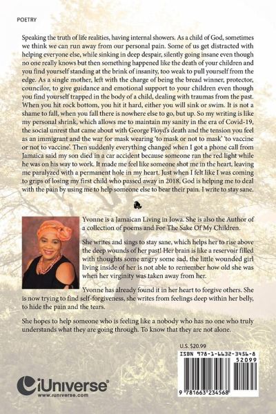 Speaking the truth of life realities, having internal showers. As a child of God, sometimes we think we can run away from our personal pain. Some of us get distracted with helping everyone else, while sinking in deep despair, silently going insane even though no one really knows but then something happened like the death of your children and you find yourself standing at the brink of insanity, too weak to pull yourself from the edge. As a single mother, left with the charge of being the bread winner, protector, councilor, to give guidance and emotional support to your children even though you find yourself trapped in the body of a child, dealing with traumas from the past. When you hit rock bottom, you hit it hard, either you will sink or swim. It is not a shame to fall, when you fall there is nowhere else to go, but up. So my writing is like my personal shrink, which allows me to maintain my sanity in the era of Covid-19, the social unrest that came about with George Floyd's death and the tension you feel as an immigrant and the war for mask wearing 'to mask or not to mask' 'to vaccine or not to vaccine'. Then suddenly everything changed when I got a phone call from Jamaica said my son died in a car accident because someone ran the red light while he was on his way to work. It made me feel like someone shot me in the heart, leaving me paralyzed with a permanent hole in my heart. Just when I felt like I was coming to grips of losing my first child who passed away in 2018, God is helping me to deal with the pain by using me to help someone else to bear their pain. I write to stay sane.