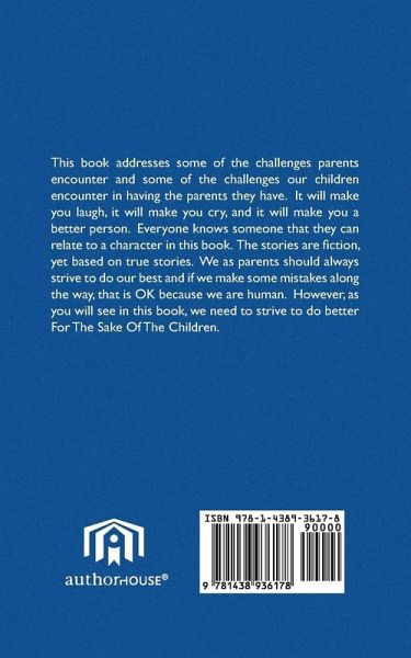 This book addresses some of the challenges parents encounter and some of the challenges our children encounter in having the parents they have. It will make you laugh, it will make you cry, and it will make you a better person. Everyone knows someone that they can relate to a character in this book. The stories are fiction, yet based on true stories. We as parents should always strive to do our best and if we make some mistakes along the way, that is OK because we are human. However, as you will see in this book, we need to strive to do better For The Sake Of The Children.