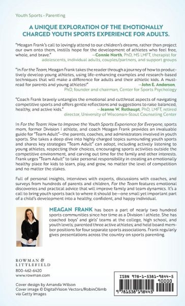 A unique exploration of the emotionally charged adult youth sports experience. Fewer than 2% of athletes ever play Division I sports, and for those who do, it's not always a positive experience. The pressures begin in youth sports and rarely let up. "Team Adult"-the parents, coaches, and administrators facilitating youth, high school, and college sports-need to turn inward and explore their own motivations and intentions in order to effect real change for the benefit of young athletes everywhere. In For the Team: How to Improve the Youth Sports Experience for Everyone, sports mom, former Division I athlete, and coach Meagan Frank provides an invaluable guide for the adults in the youth sports landscape. She urges them to take personal responsibility in creating an emotionally healthy place for kids to learn, play, and grow, no matter the level of competition and no matter the stakes. Frank takes a deep-dive into highly-charged topics surrounding youth sports and shares key strategies "Team Adult" can adopt, including actively listening to the young athletes, respecting their choices, encouraging sports activities outside of the competitive environment, and carving out time for the family and other interests. Full of personal insights, interviews with experts, discussions with coaches, and surveys from hundreds of parents and children, For the Team features emotional discoveries and practical advice that will improve family and team dynamics and bring youth sports back to where it should be-as one small yet important part of a child's development into a healthy, confident, and happy individual.
