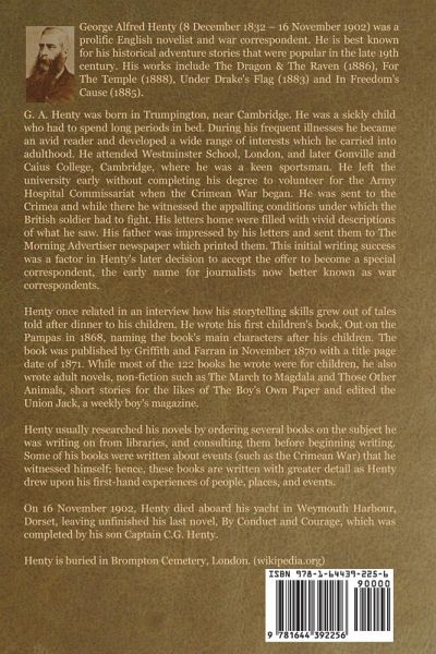 George Alfred Henty (8 December 1832 – 16 November 1902) was a prolific English novelist and war correspondent. He is best known for his historical adventure stories that were popular in the late 19th century. His works include The Dragon & The Raven (1886), For The Temple (1888), Under Drake's Flag (1883) and In Freedom's Cause (1885). G. A. Henty was born in Trumpington, near Cambridge. He was a sickly child who had to spend long periods in bed. During his frequent illnesses he became an avid reader and developed a wide range of interests which he carried into adulthood. He attended Westminster School, London, and later Gonville and Caius College, Cambridge, where he was a keen sportsman. He left the university early without completing his degree to volunteer for the Army Hospital Commissariat when the Crimean War began. He was sent to the Crimea and while there he witnessed the appalling conditions under which the British soldier had to fight. His letters home were filled with vivid descriptions of what he saw. His father was impressed by his letters and sent them to The Morning Advertiser newspaper which printed them. This initial writing success was a factor in Henty's later decision to accept the offer to become a special correspondent, the early name for journalists now better known as war correspondents. Henty once related in an interview how his storytelling skills grew out of tales told after dinner to his children. He wrote his first children's book, Out on the Pampas in 1868, naming the book's main characters after his children. The book was published by Griffith and Farran in November 1870 with a title page date of 1871. While most of the 122 books he wrote were for children, he also wrote adult novels, non-fiction such as The March to Magdala and Those Other Animals, short stories for the likes of The Boy's Own Paper and edited the Union Jack, a weekly boy's magazine. Henty usually researched his novels by ordering several books on the subject he was writing on from libraries, and consulting them before beginning writing. Some of his books were written about events (such as the Crimean War) that he witnessed himself; hence, these books are written with greater detail as Henty drew upon his first-hand experiences of people, places, and events. On 16 November 1902, Henty died aboard his yacht in Weymouth Harbour, Dorset, leaving unfinished his last novel, By Conduct and Courage, which was completed by his son Captain C.G. Henty. Henty is buried in Brompton Cemetery, London. (wikipedia.org)