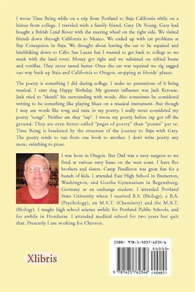 I wrote Time Being while on a trip from Portland to Baja California while on a hiatus from college. I traveled with a family friend, Gary De Young. Gary had bought a British Land Rover with the steering wheel on the right side. We visited friends down through California to Mexico. We ended up with car problems at Bay Concepcion in Baja. We thought about leaving the car to be repaired and hitchhiking down to Cabo San Lucan but I wanted to get back to college so we stuck with the land rover. Money got tight and we subsisted on refried beans and tortillas. They never tasted better. Once the car was repaired we zig zagged our way back up Baja and California to Oregon, stopping at friends' places. The poetry is something I did during college. I make no pretentions of it being musical. I cant sing Happy Birthday. My greatest influence was Jack Kerouac. Jack tried to "sketch" his surrounding with words. Also sometimes he considered writing to be something like playing blues on a musical instrument. But though I may use words like song and tune in my poetry, I really never considered my poetry "songs". Neither are they "rap". I wrote my poetry before rap got off the ground. They are even better called "pages of poetry" than "poems" per se. Time Being is bracketed by the structure of the journey to Baja with Gary. The poetry tends to run from one book to another. I don't write poetry any more, switching to prose.