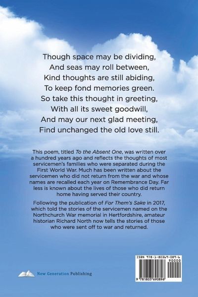 Though space may be dividing, And seas may roll between, Kind thoughts are still abiding, To keep fond memories green. So take this thought in greeting, With all its sweet goodwill, And may our next glad meeting, Find unchanged the old love still. This poem, titled To the Absent One, was written over a hundred years ago and reflects the thoughts of most servicemen's families who were separated during the First World War. Much has been written about the servicemen who did not return from the war and whose names are recalled each year on Remembrance Day. Far less is known about the lives of those who did return home having served their country. Following the publication of For Them's Sake in 2017, which told the stories of the servicemen named on the Northchurch War memorial in Hertfordshire, amateur historian Richard North now tells the stories of those who were sent off to war and returned.
