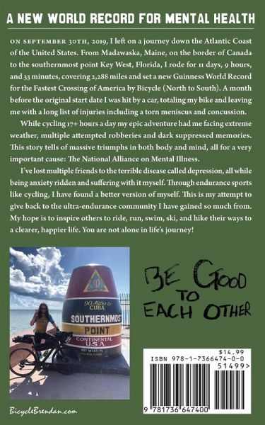A NEW WORLD RECORD FOR MENTAL HEALTH. On September 30th, 2019, I left on a journey down the Atlantic Coast of the United States. From Madawaska, Maine, on the border of Canada to the southernmost point Key West, Florida, I rode for 11 days, 9 hours, and 33 minutes, covering 2,288 miles and set a new Guinness World Record for the Fastest Crossing of America by Bicycle (North to South). A month before the original start date I was hit by a car, totaling my bike and leaving me with a long list of injuries including a torn meniscus and concussion. While cycling 17+ hours a day my epic adventure had me facing extreme weather, multiple attempted robberies and dark suppressed memories. This story tells of massive triumphs in both body and mind, all for a very important cause: The National Alliance on Mental Illness. I've lost multiple friends to the terrible disease called depression, all while being anxiety ridden and suffering with it myself. Through endurance sports like cycling, I have found a better version of myself. This is my attempt to give back to the ultra-endurance community I have gained so much from. My hope is to inspire others to ride, run, swim, ski, and hike their ways to a clearer, happier life. You are not alone in life's journey!